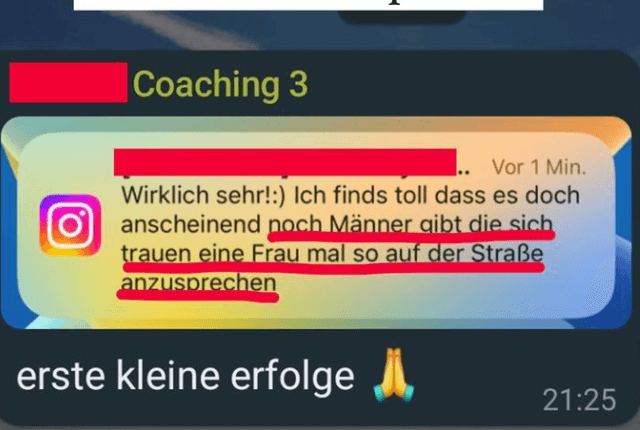 Durch unser großes Coaching-Team von 6 Coaches bieten wird eine Rundumbetreuung. Jeder Coach hat sein Fachgebiet im Dating über Onlinedating, Frauen im Alltag oder beim Feiern ansprechen, mit Frauen schreiben, Style verbessern, maskuliner auftreten etc. Jeder Kunde wird individuell 1:1 betreut, zusätzlich hat er die Möglichkeit, an Livecoachings (in Person) teilzunehmen, seine Blockaden von unserem Mindsetcoach lösen zu lassen, Zugang zu einem umfangreichen Videotraining und hat Zugang zu unserer riesigen Community, um sich mit anderen Männern, die auch an sich arbeiten, zu vernetzen (In Deutschland/Österreich/Schweiz).